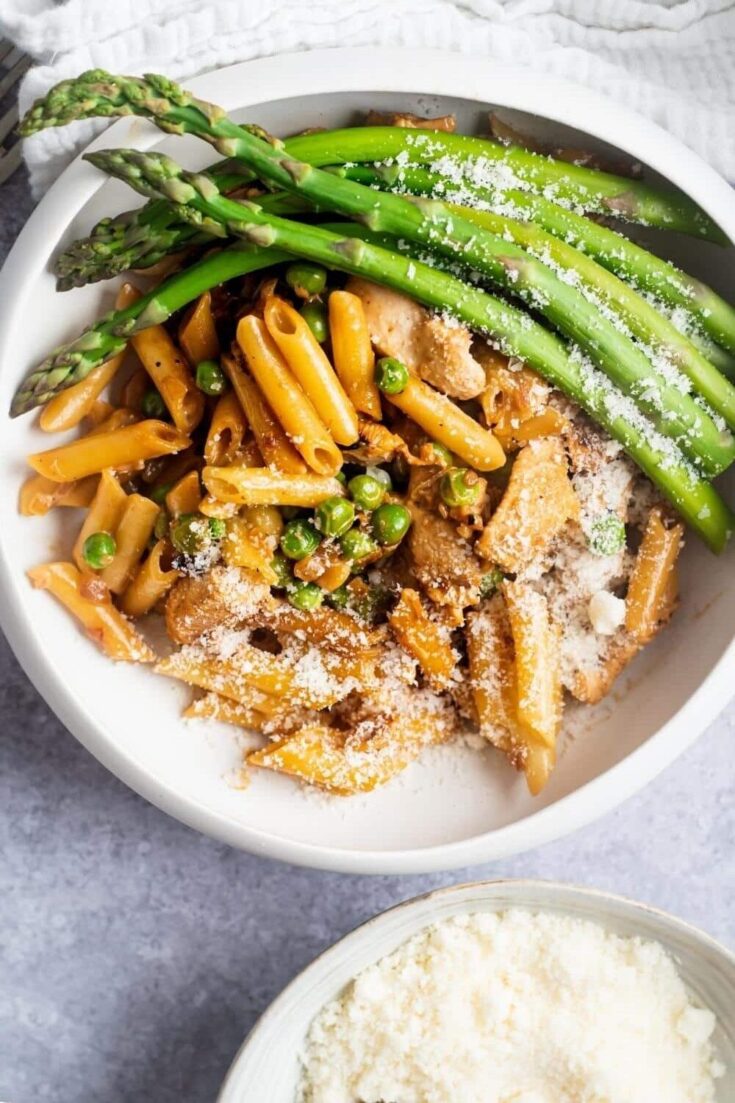 Yes, but it’s best served fresh so the pasta and vegetables keep their texture. If making ahead, prepare the sauce and chicken in advance, then reheat gently and toss with freshly cooked pasta and vegetables right before serving.
