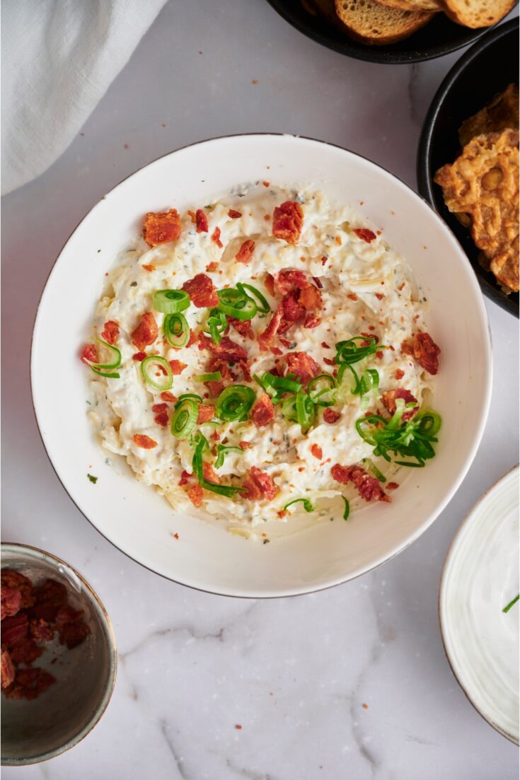 - Top with cooked bacon and green onions and serve with bread, crackers, or veggies for dipping.