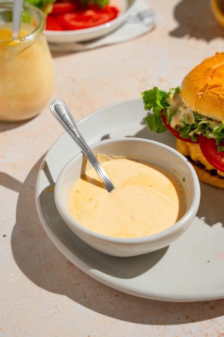 This homemade burger sauce lasts for up to 5 days in the refrigerator when stored in an airtight container or glass jar. Always stir it before using to refresh the texture. Since it’s mayo-based, it’s not freezer-friendly — freezing can cause the sauce to separate and lose its creamy consistency.
